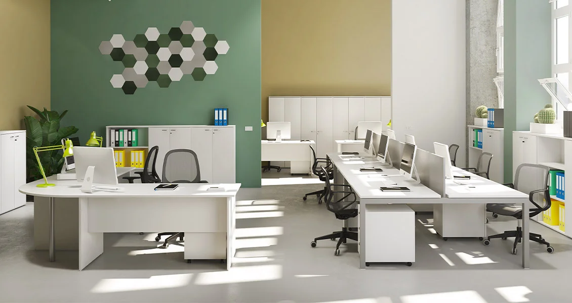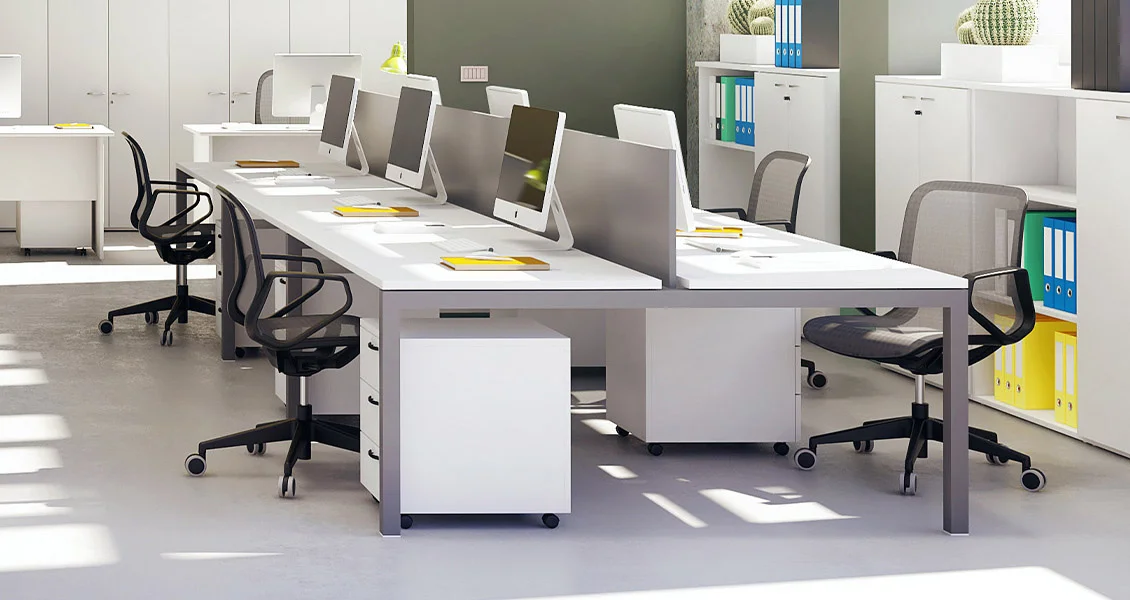 Semplice ed essenziale. Una linea per tutti gli ambienti e che risponde ad ogni esigenza. Una gamma infinita di elementi a tua disposizione in molteplici finiture! Linea con elementi realizzati in melaminico antigraffio e antiriflesso. Piani scrivania (sp. 22 mm) con fianchi disponibili nella versione melaminico (sp. 22 mm), con gamba metallica a “L” in vari colori o con gamba metallica “Tech”. I mobili hanno top (sp. 22 mm), struttura (sp. 18 mm), ripiani (sp. 18 mm).